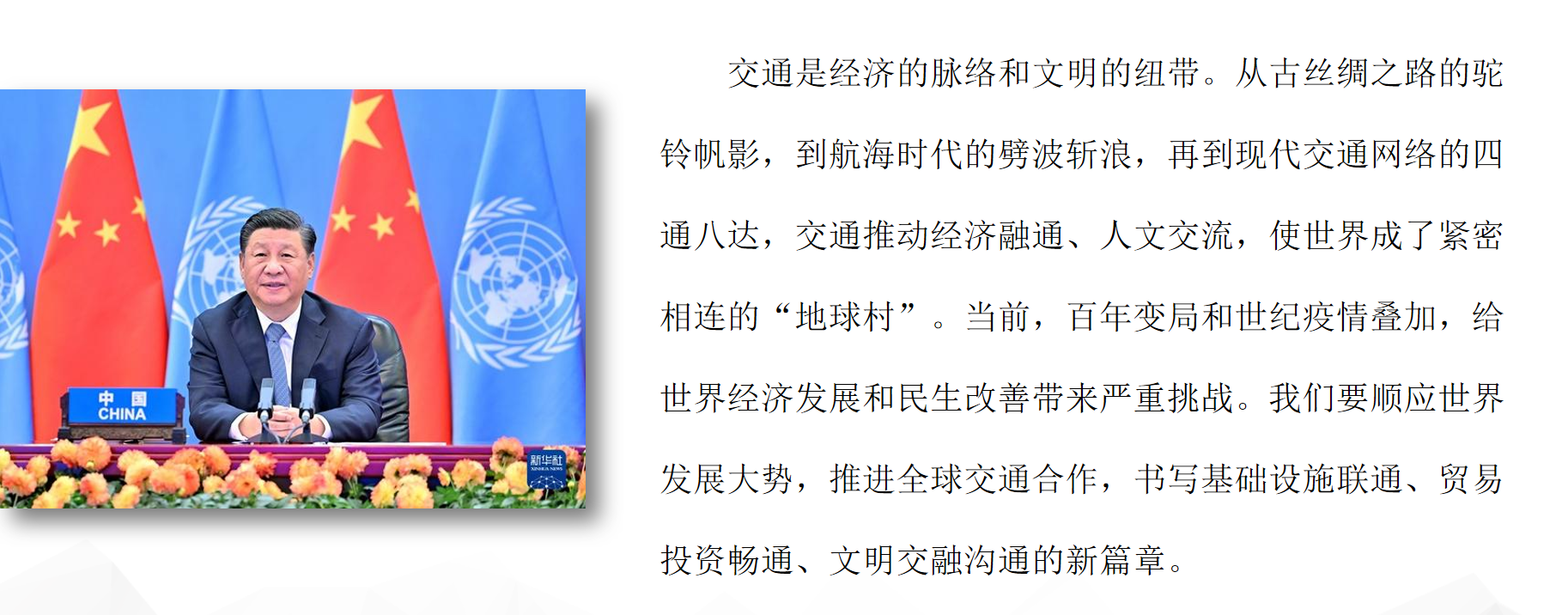 主题二:与世界相交 与时代相通在可持续发展道路上阔步前行——习近平在第二届联合国全球可持续交通大会开幕式上的主旨讲话