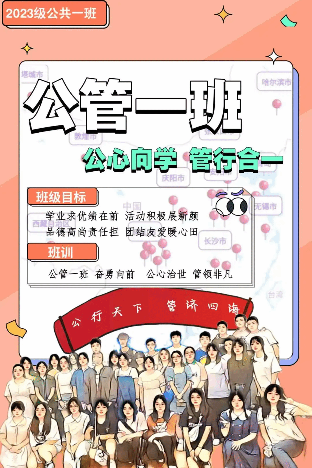 班级介绍:公行天下,管致四方。始于2022年八月盛夏的初始,管一携手走上一路生花的征程。两年的时光中,德育潜移默化,树立正确价值;智育浇灌素养,营造勤学氛围;体育强健体魄,赛场展现雄姿;美育陶冶情操,丰富个人阅历;劳育躬身实践,崇尚务实风范。山山而川,人生海海。两年的时光中,管一由30个来自天南海北的小小个体,制定班级有序的管理,营造互相友爱的环境,树立积极向上的姿态,奋勇争先,多位同学在学术科研、文体竞赛、社会实践多个领域崭露头角,绽放光芒。未来的时光里,管一将不负韶华,不负众望,奔赴向管一的星辰大海。