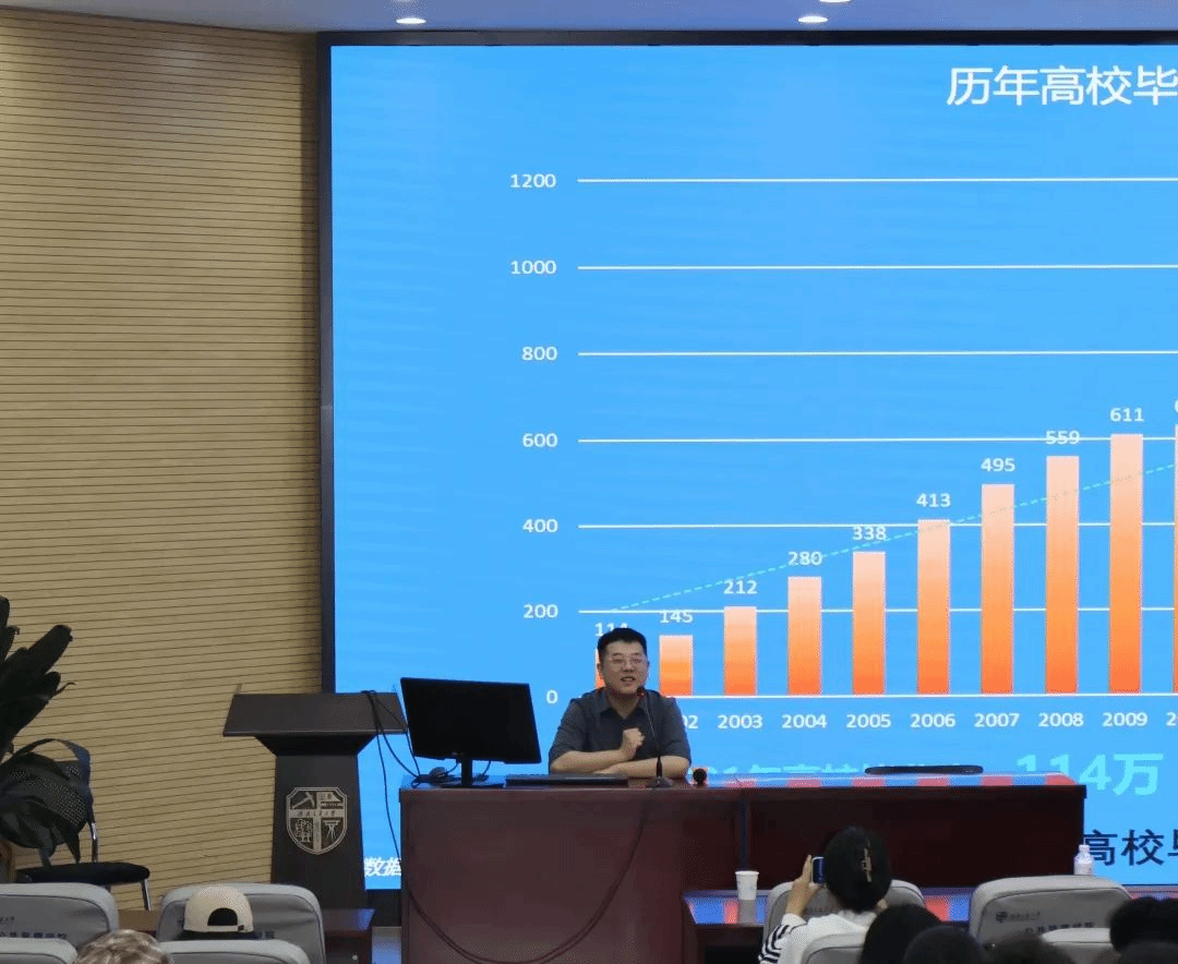 讲座初始,吴老师向大家展示了当前国内高校深造情况发展图以及留学形势图,说明本科毕业生寻求继续深造是大势所趋。“国内深造和留学深造殊途同归,没有孰优孰劣,选择适合自己的就好。”