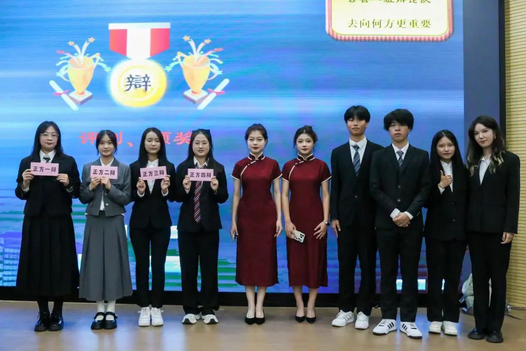 本次新生辩论赛决赛以“与谁同行更重要vs去向何处更重要”为辩题。首先是立论环节,双方辩手从不同的角度对辩题展开阐释。
