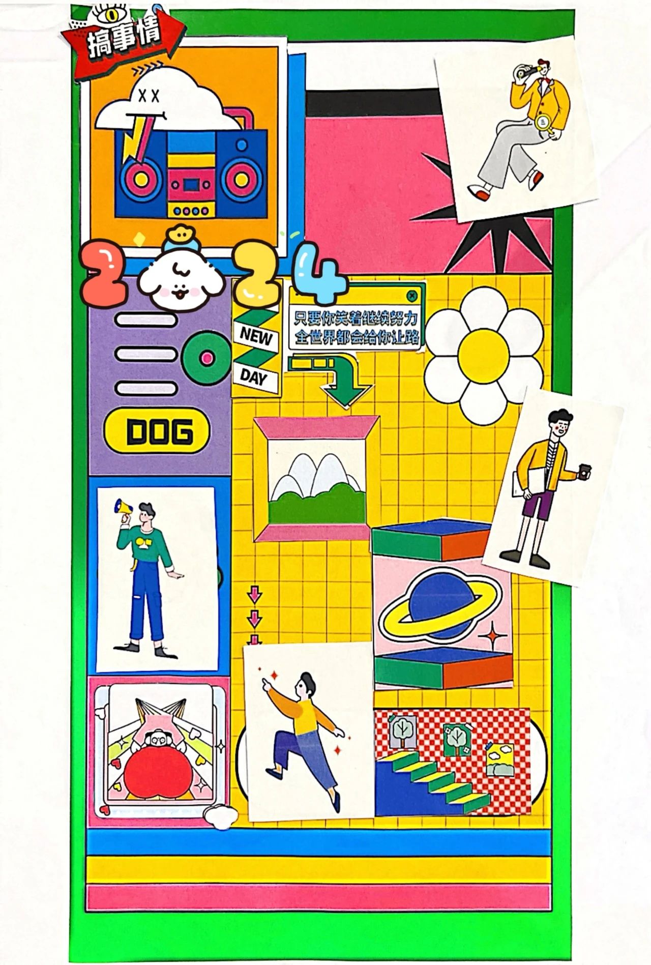 在本活动中,同学们可以用1-3个素材来共同设计拼贴海报,大家在现场充分体会到海报设计的乐趣与不易。现场创意迸发,同学们接龙拼贴自己心仪的素材贴纸,属于记者的创意精神也铭刻于大家心中。下面是本次活动中大家共同完成的海报: