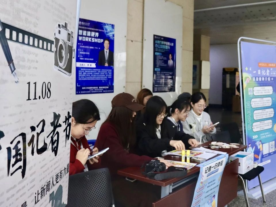 记者体验活动于上午11:30准时开始,期间由于天气原因,举办“阵地”从一食堂十字路口迁至四号教学楼入口处,但细雨并未浇灭大家的热情。