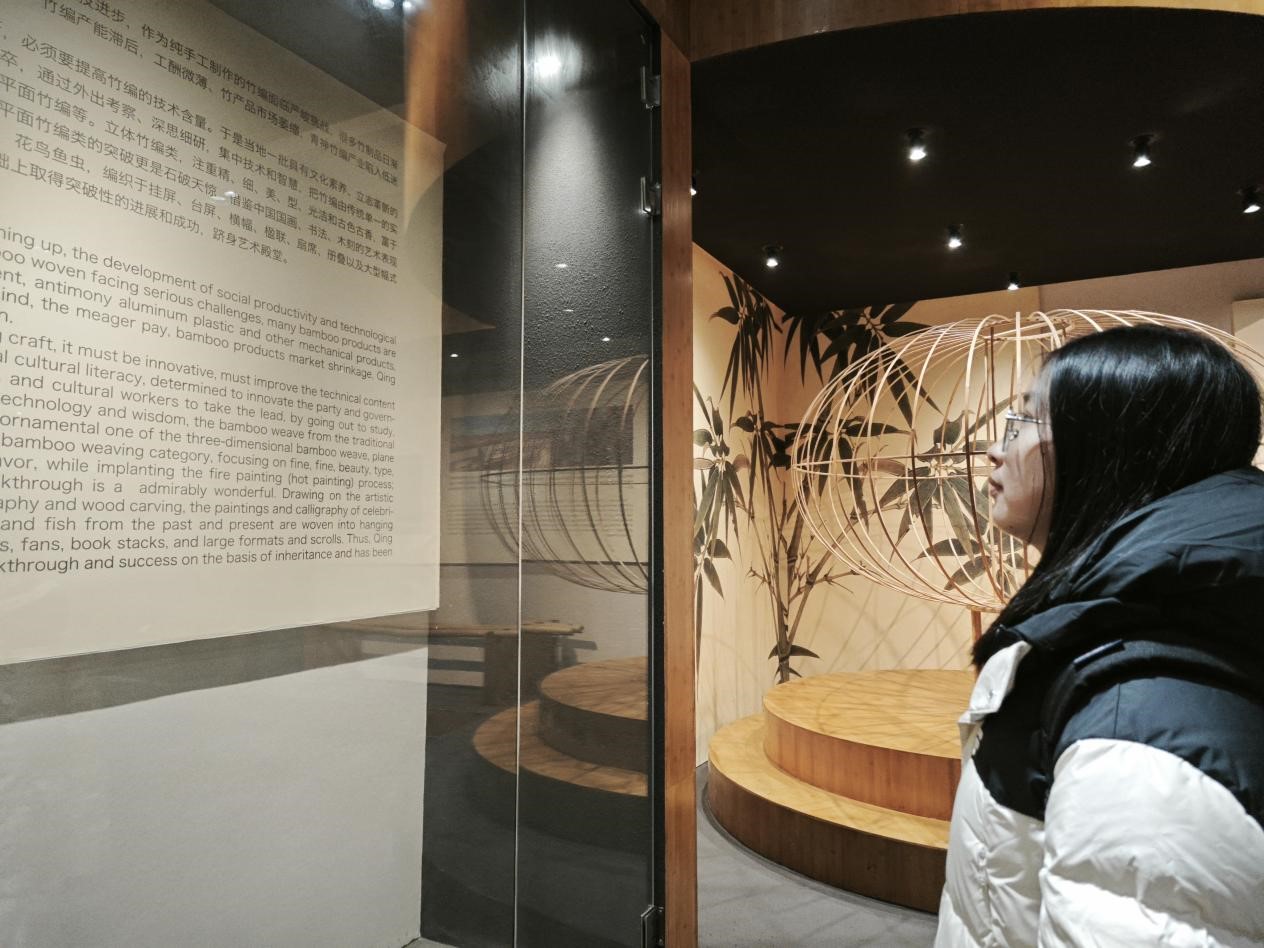 在兰沟村,小队成员首先参观走访了国际竹编艺术博览馆、竹编博物馆等竹编文化场所,深入了解竹编艺术的历史渊源与独特魅力,以及其艺术价值和市场潜力。馆内陈列的作品不仅技艺精湛,且皆蕴含着丰富的文化内涵。团队成员在此过程中深刻体会到了竹编产业在传承传统文化、促进地方经济发展方面所起的重要作用。