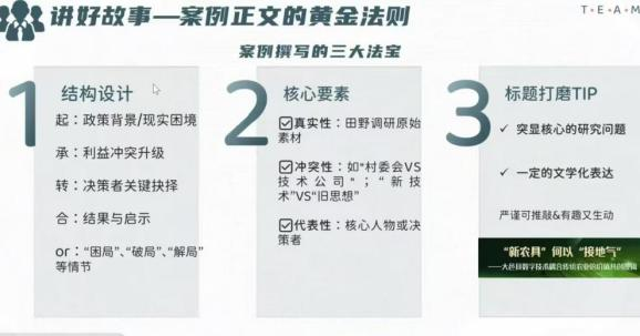 随后,李聃宁同学分享了案例正文撰写技巧。她认为案例撰写有三大“法宝”,分别是结构设计、核心要素以及标题打磨。在核心要素方面,她着重解释了“冲突性”的含义,并强调其重要性。