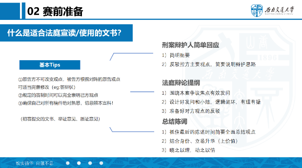 最后,刘佳昕同学聚焦复赛与决赛的实战场景,从“赛前准备”到“赛场表现”进行层层深入地讲解。在赛前准备上,她耐心解答针对辩状修改、法庭辩论提纲设计等容易出错的细节,并总结出三大要点:一是文书需“绝对熟悉”,避免照本宣科;二是庭辩需“逻辑闭环”,通过预设问题与反驳实现攻防一体;三是总结陈词要“情理结合”,善用身份立场升华观点。她以自身经历为例,指出了赛场表现上的四大加分点,与众不同的设计亮点、“大火猛攻”法庭辩论、“绵里藏刀”话术技巧以及“栩栩如生”表现技巧。