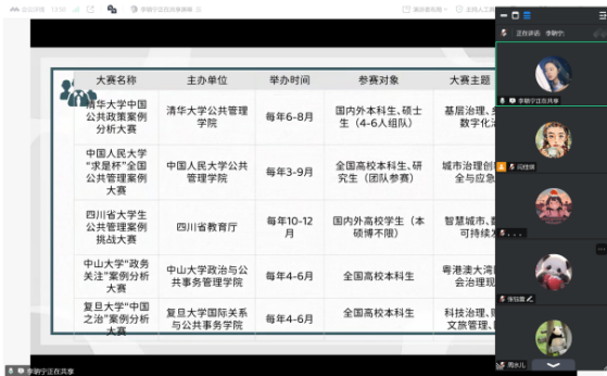 4月1日晚,由李聃宁同学进行了公共管理案例大赛经验分享。首先,李聃宁同学详细介绍了“何为案例大赛”,接着分享了她总结的选题公式,向大家强调了选题要“真”,要有现实关切与地域特色。而面对同学们不知道从哪里寻找案例的疑问,她推荐了权威评选出的“标兵案例”以及大赛获奖案例作为参考。