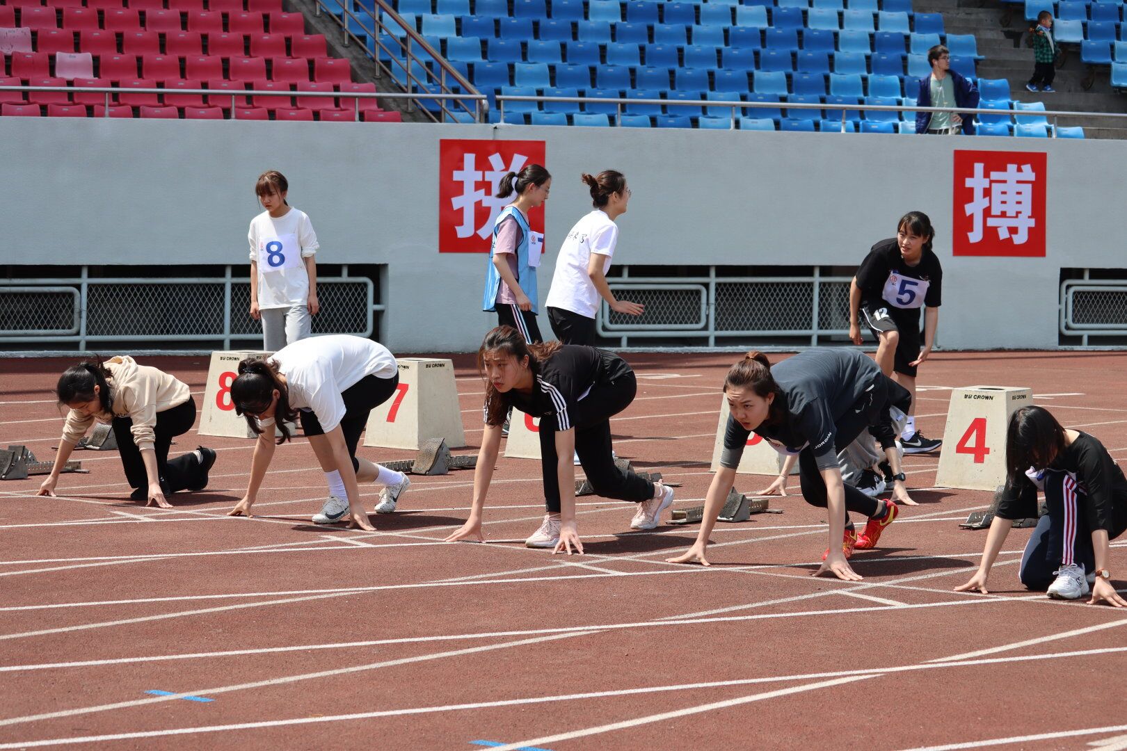 渐入初夏,午后的阳光透过淡薄的云层,倾泻在绿茵场上,地面仿佛镀了一层金辉。微风中夹带着的一丝燥热,让下午场的运动会现场气氛更显紧张。在观众热情的欢呼声中,运动会首日下半程赛程:男子100米(决赛)、女子100米(决赛)、女子800米(决赛)、男子4×100米(决赛)、女子4×100米(决赛)以及女子立定三级跳远(决赛)六个项目依次展开。