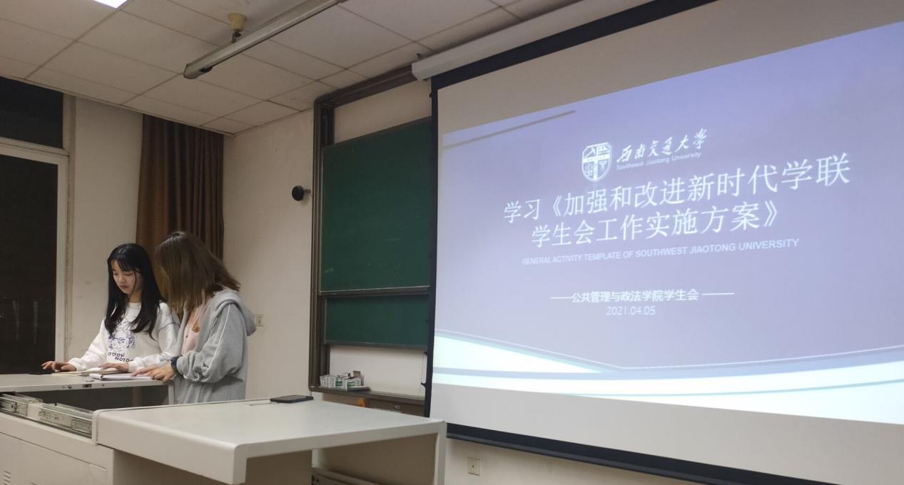学生会在2021年4月3日,以部门为单位,采取线上线下相结合的方式,开展了对《加强和改进新时代学联学生会工作实施方案》的学习活动,对新学期的学生工作进行了方针上的指导,为提高学生会组织与工作能力、加强学生会内部凝聚力提供了方向。