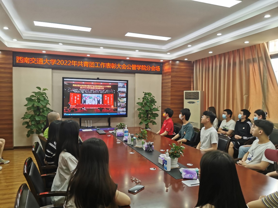 With May 4th Youth Day around the corner, in order to commend the advanced, select the typical representatives and encourage all the youth in the university to strive for success, on the afternoon of April 29, Southwest Jiaotong University held the commendation meeting of the Communist Youth League in 2022 to celebrate the 100th anniversary of the founding of the Communist Youth League of China with the theme of “ Celebrating the Party Congress, Paying Tribute to the 20th National Congress of CPC and Forge Ahead in a New Journey”. Wang Shunhong, Secretary of the CPC SWJTU Committee, Gui Fuqiang, Deputy Secretary of the CPC SWJTU Committee, Zhang Xuelong, Deputy Secretary of the Party Committee and Secretary of Discipline Inspection Commission of SWJTU, Yang Aihua, Deputy Secretary of the CPC SWJTU Committee, Yao Faming, member of the Standing Committee of the Party Committee and Vice President of SWJTU, He Chuan, member of the Standing Committee of the Party Committee and Vice President of SWJTU, Shen Huoming, member of the Standing Committee of the Party Committee and Vice President of SWJTU, Kang Guozheng, member of the Standing Committee of the Party Committee and Vice President of SWJTU, Liu Changjun, member of the Standing Committee of the Party Committee and Vice President of SWJTU, and other leaders of the related units attended the conference, and the heads of school league organizations at all levels, representatives of young staff, youth representatives of league members and representatives of award-winning teachers and students participated in the conference. Meanwhile, the School of Public Affairs and Law set parallel sessions in room1212, Teaching Building, No.0, Jiuli Campus, Southwest Jiaotong University, and organized the award-winning representatives and youth league members to participate in the conference via online video synchronously, and the conference was presided over by Zhang Junqi, Secretary of the Communist Youth League of Committee of Southwest Jiaotong University.