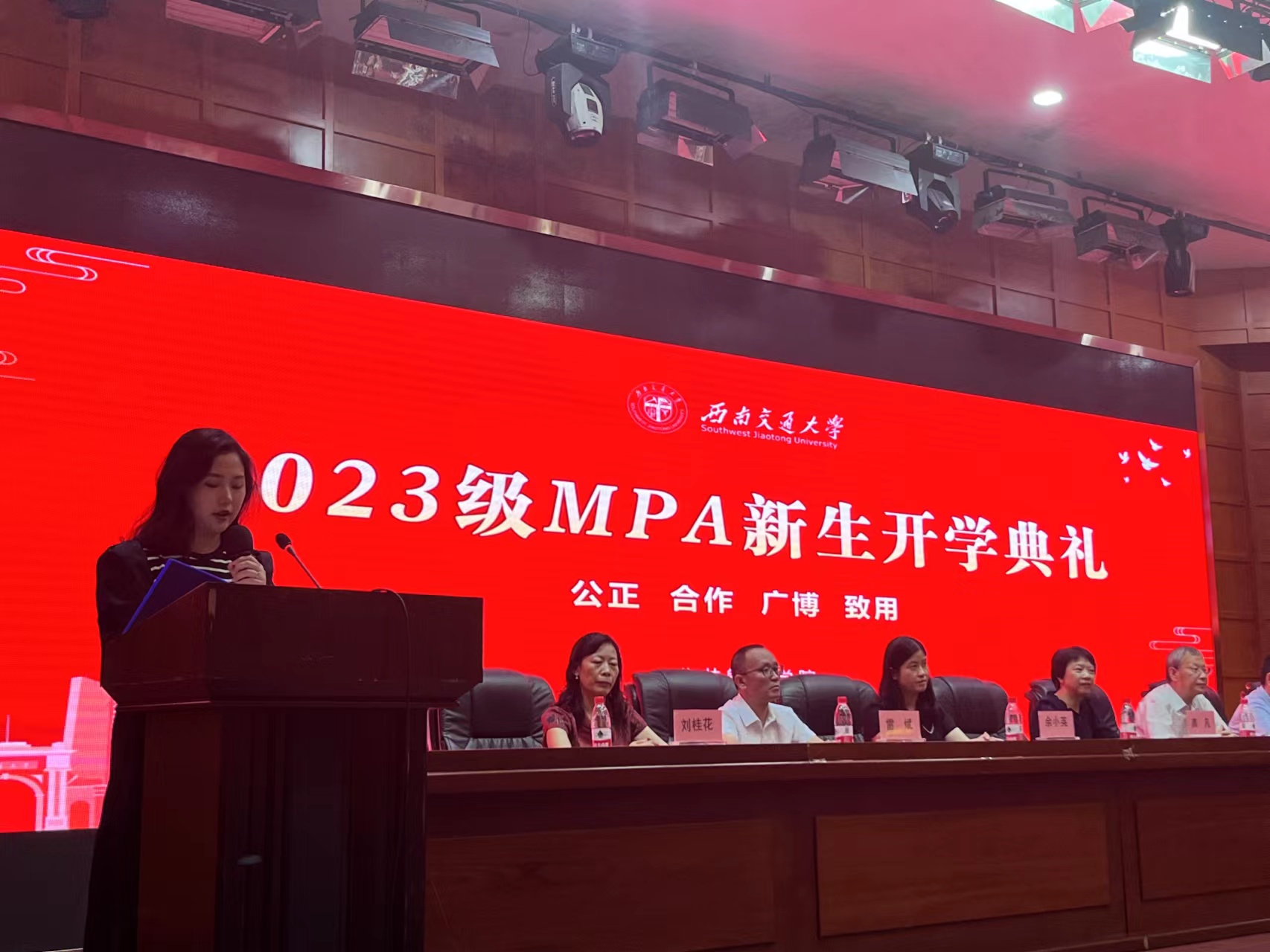随后,来自邛崃市财政局的陈婕代表2023级MPA全体新生上台发言,向老师和同学们分享自己对未来的无限憧憬与期盼。陈婕同学表示,大家不仅是新时代的见证者和亲历者,更是新时代的建设者和开创者。她希望同学们具备“汇滴水而成海,集狐腋以成裘”的恒心和毅力;拥有“胸中有丘壑,执笔壮山河”的智慧和勇气,以及“长风破浪会有时,直挂云帆济沧海”的胸怀和壮志;肩负起新时代的伟大使命,以校训为指引,精勤求学、敦笃励志、果毅力行、忠恕任事,共同在交大的求学路上书写新的篇章。在中国式现代化进程的伟大实践中绽放绚丽青春,为中华民族的伟大复兴贡献力量!