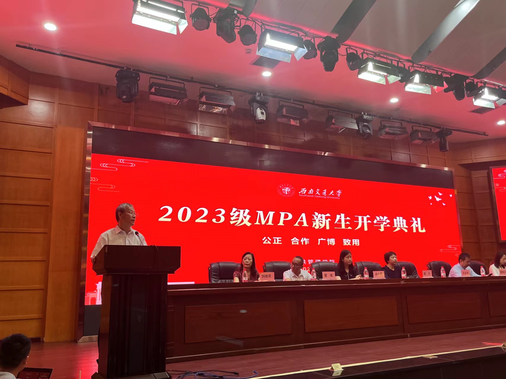 王院长首先对2023级MPA新生们表达了热烈欢迎和真挚祝福,随后对刚刚踏入西南交大的MPA学子们提出了三点希望:其一是胸怀格局。他希望每一个MPA学子在今天后能够胸怀天下,放眼未来,有“大气象”“大格局”,心藏静气与定力,能够坐得住板凳,静得下心,实现自我的不断提升;其二是心存敬畏。君子有三畏:畏天,畏大人,畏圣人之言。他相信同学们在未来都将担任不同职级的领导岗位,永葆政治本色,始终坚持崇德修身,心怀大爱。能明辨是非,弘扬社会正气,自觉做爱国主义的坚守者和传播者;其三是眼中有光。他相信大家在中心老师的关爱下,都能勇敢克服,希望在求学路上勇于追梦、敢于追梦,用青春在九里的校园里洒下奋斗的汗水。讲话最后,王院长祝愿同学们一路花香一路歌,以最自信的状态开启MPA学期新生活。