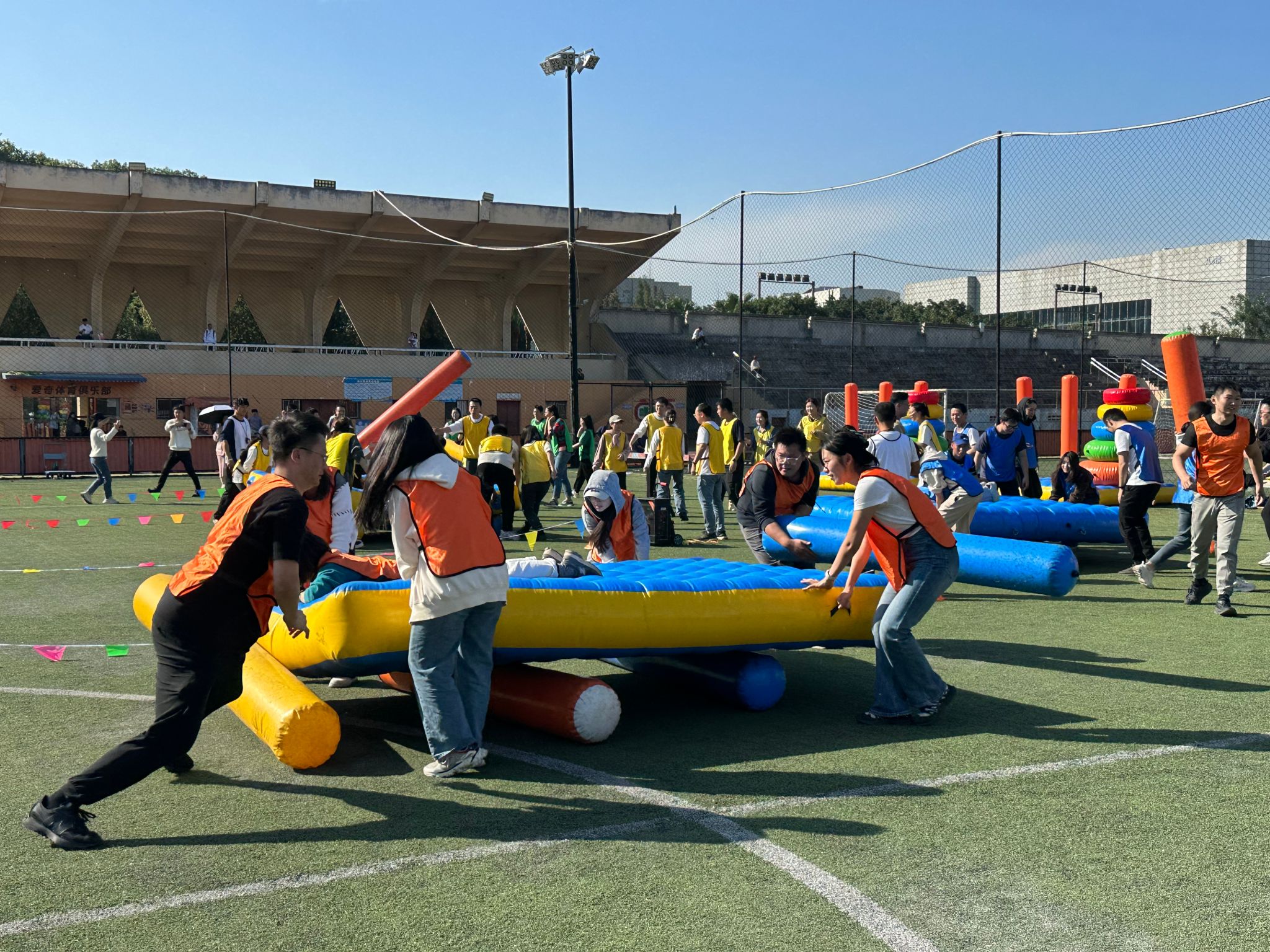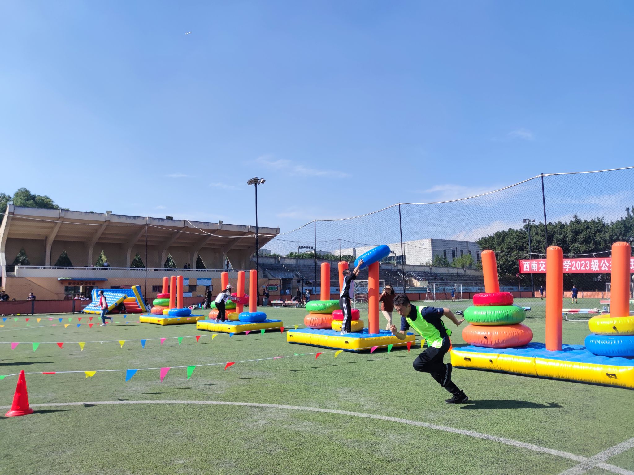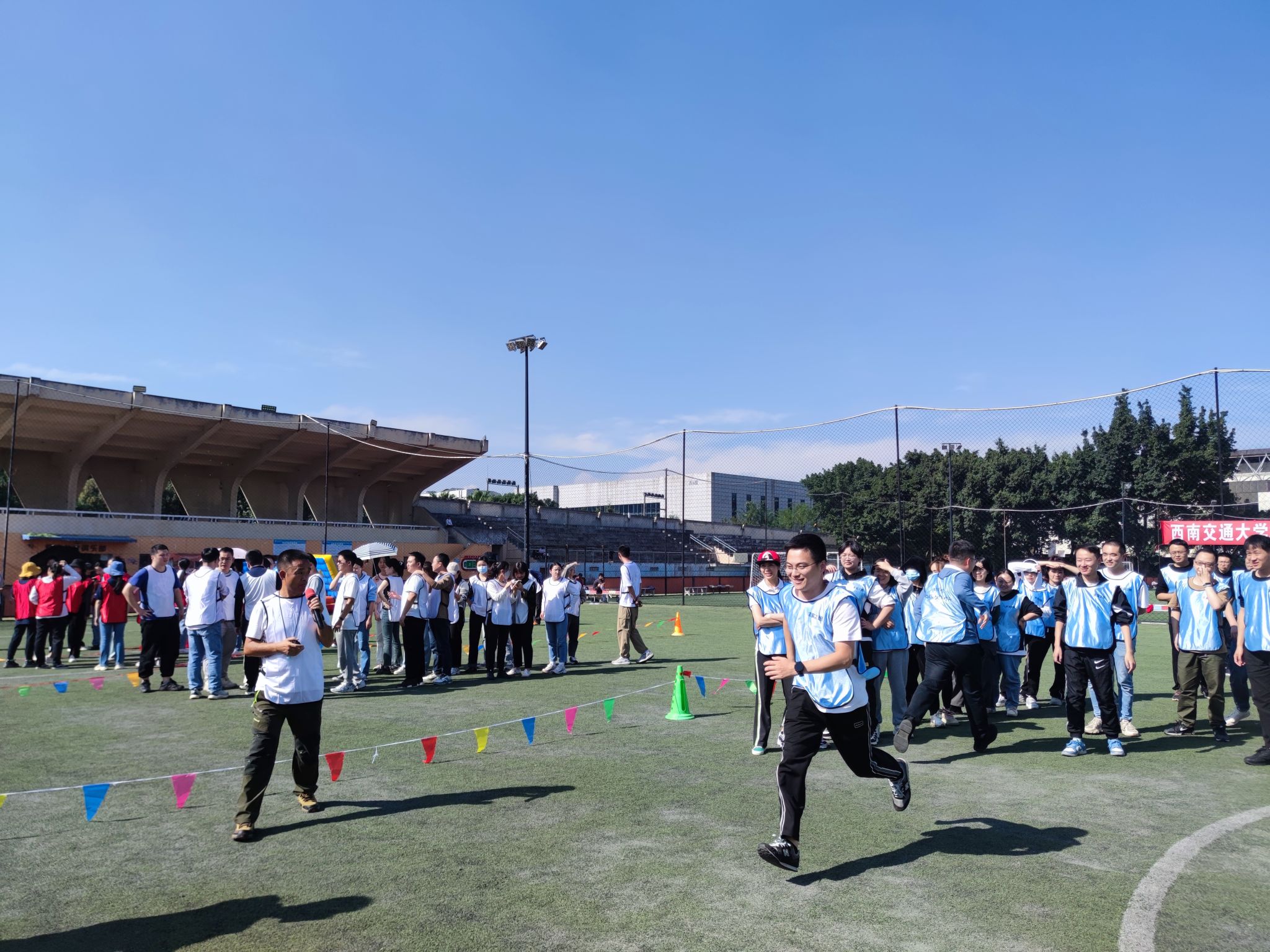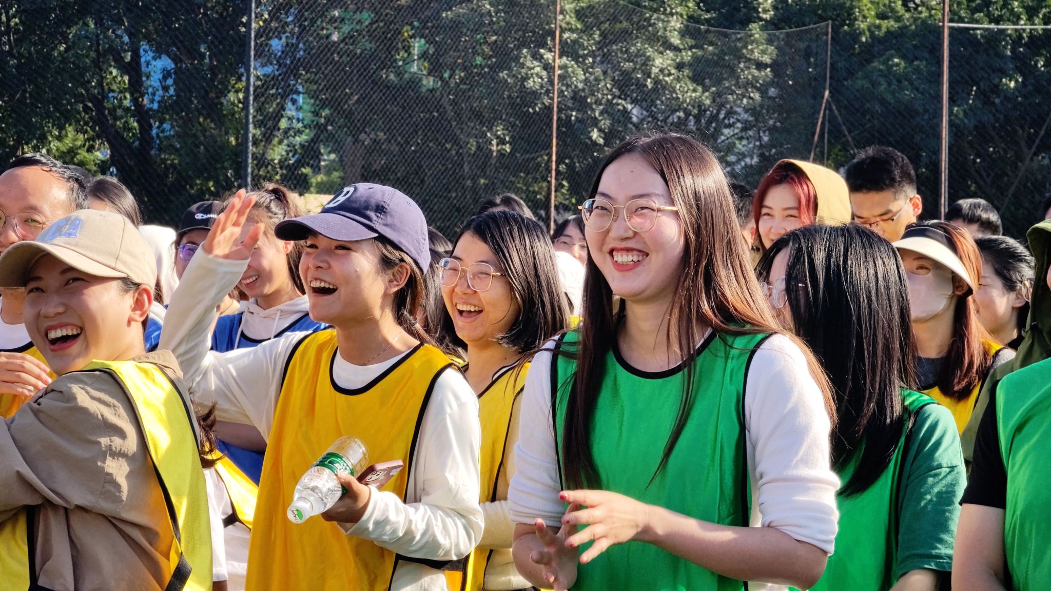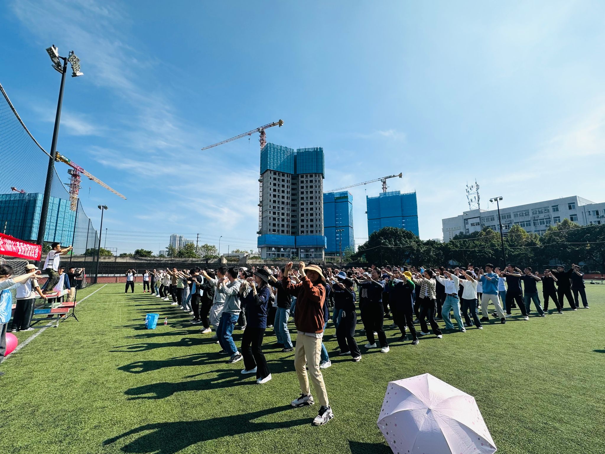 首先是有趣的热身环节,226位同学以小班为单位分为了8个组,各组同学跟随教练的“舞姿”在运动场上开始活动筋骨、舒展身躯。凉爽的秋风掺杂着阵阵欢笑声,与和煦的日光相互映衬,秋意正浓、时光正好。谈笑风生间,一股浓烈的“火药味儿”在赛场上弥漫开来。