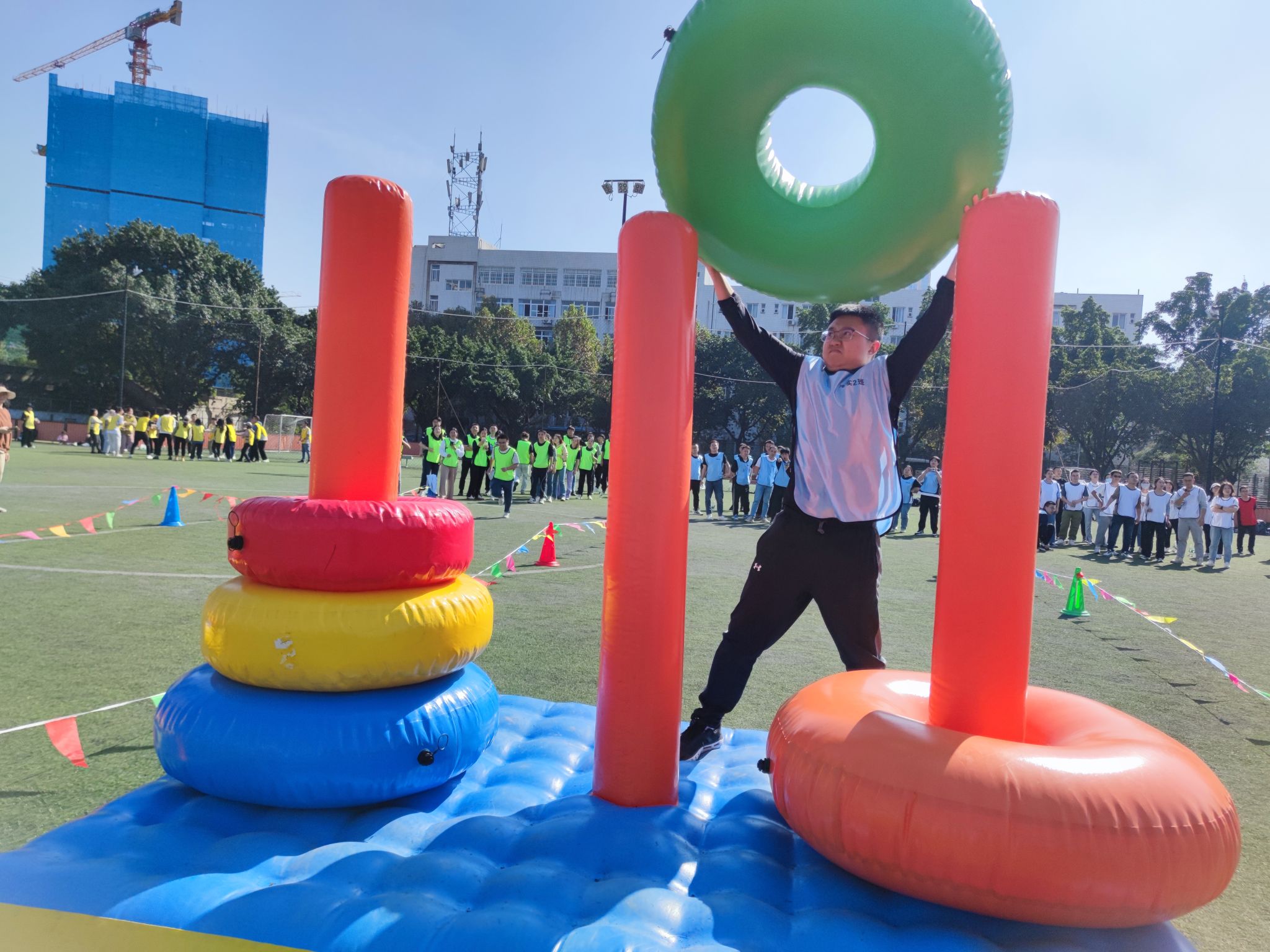 最后的压轴项目为“智慧汉诺塔”,要求队员把圆圈从下面开始按大小顺序重新摆放在另一根柱子上,并且在小圆盘上不能放大圆盘,在三根柱子之间一次只能移动一个圆盘,进一步熔炼团队意识,提升团队间的沟通能力。