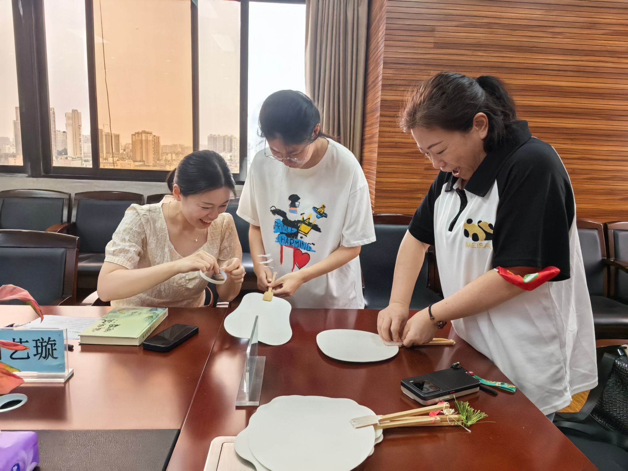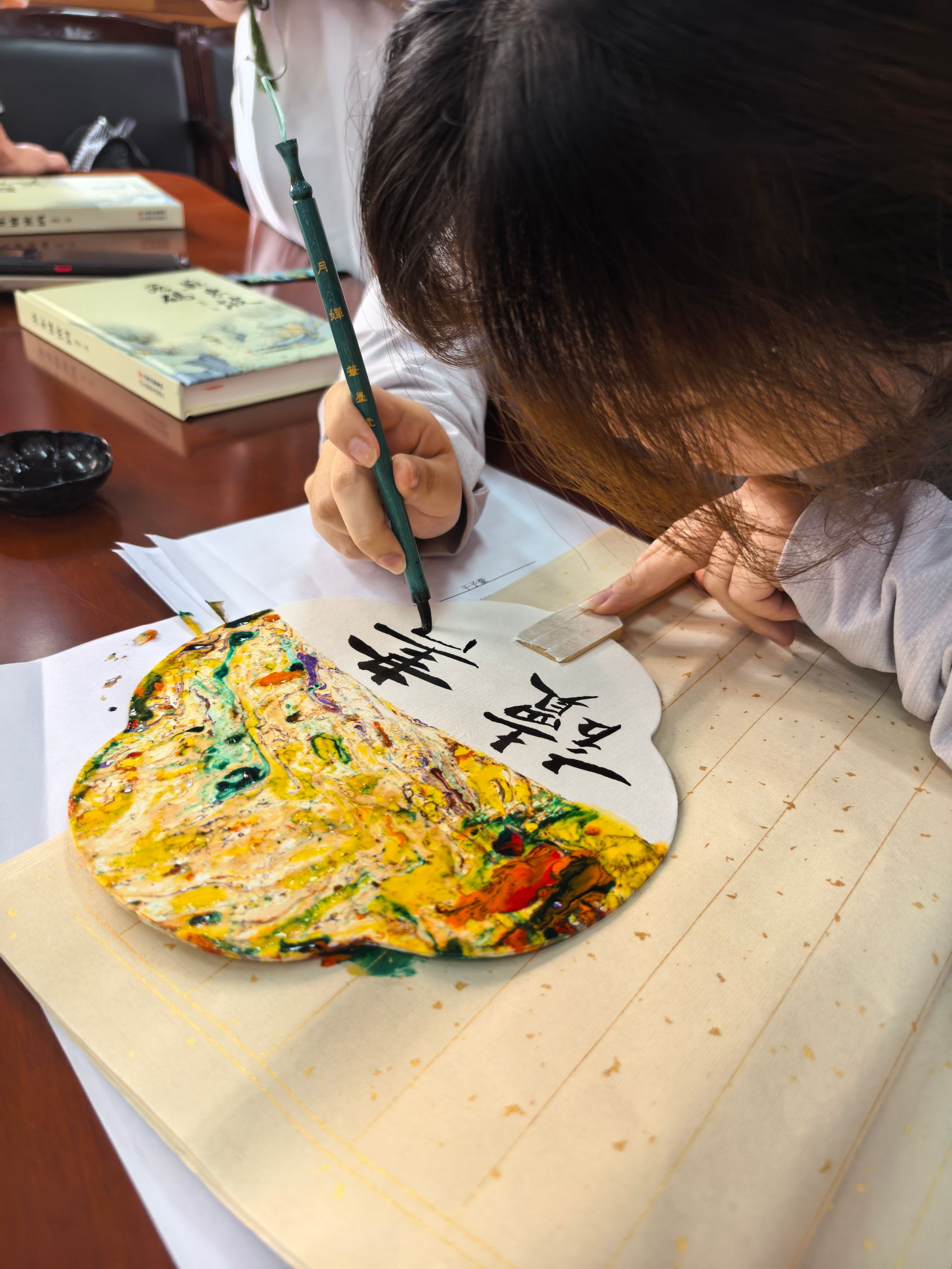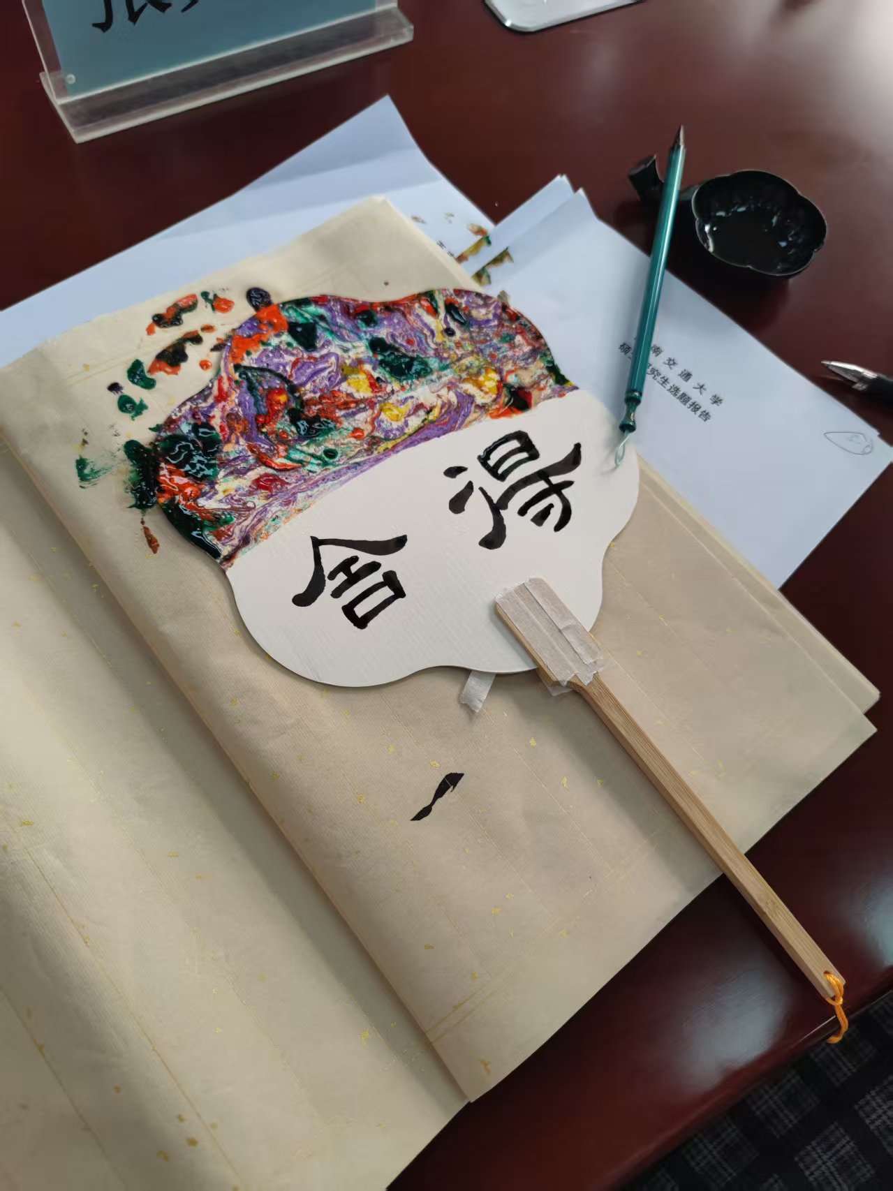 书籍分享环节后,活动现场设置“思想雅集”与“文创手作”双维度体验。在以苏轼名句的引导下,师生们结合书籍分享内容展开公共管理视角的思辨,简短分享了自身感悟;随后参与者亲手制作题字漆扇,方寸扇面间,不仅凝结着师生们对先贤的追慕,更承载着MPA人的精神锚点。