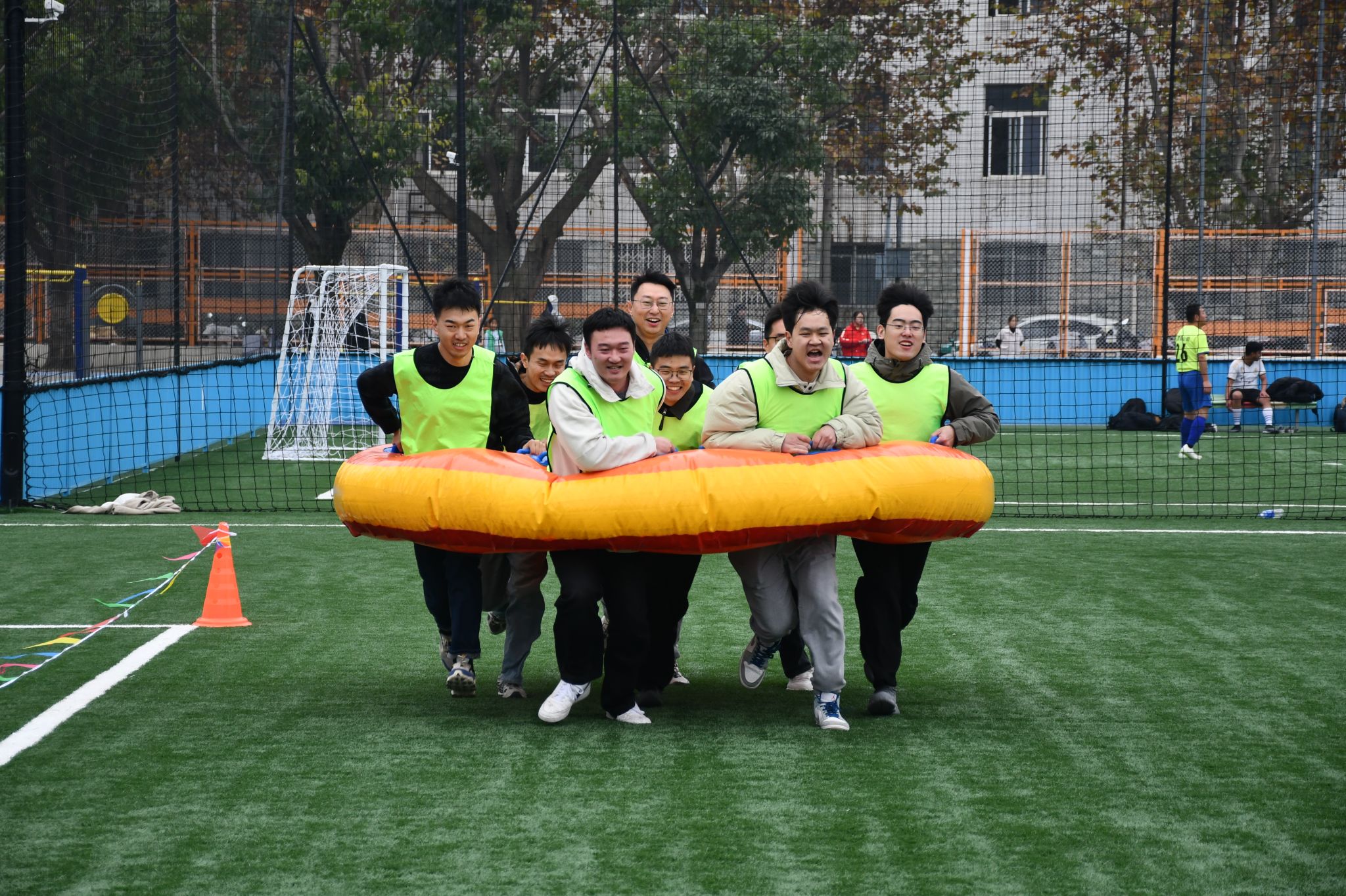 “八仙过海”项目趣味与挑战并存。队员们钻入充气道具,以折返绕桩接力完成比赛。各队赛前积极商讨策略,比赛中或稳或疾,即便偶有失误也迅速调整,展现出团队的应变能力与协作智慧。