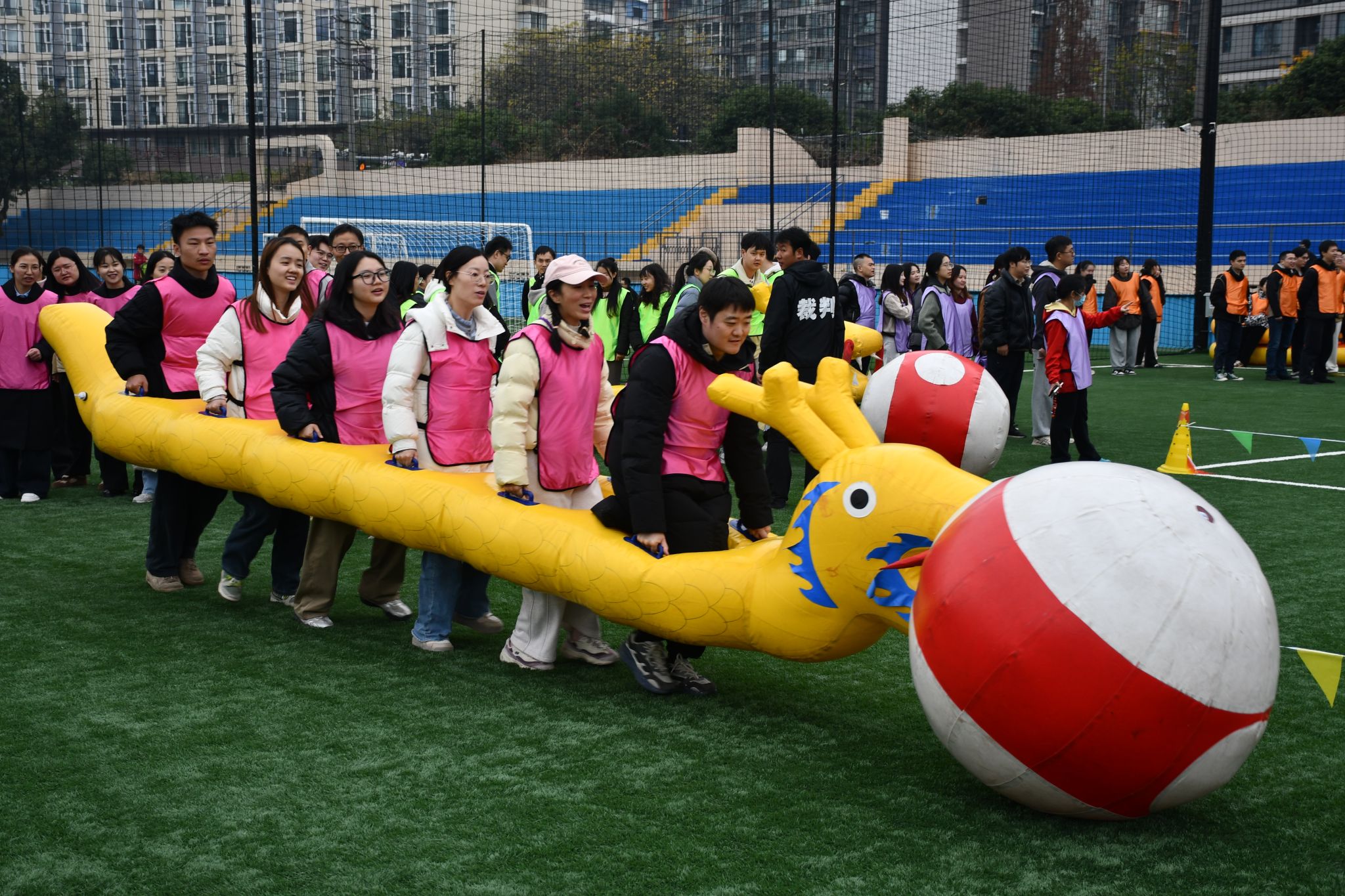 “虎步龙行”将气氛推向小高潮。队员们骑上龙形道具,协同控制方向,推动龙头部位的大球平稳向终点前进。“长龙”蜿蜒前行,师生步调一致,在默契配合中体验着并肩作战的快乐。