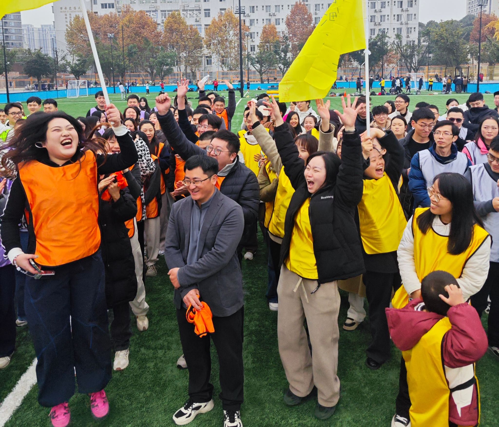 活动伊始,专业教练带领全体师生进行热身活动,动感的节奏和整齐的动作迅速驱散寒意,也让现场气氛持续升温,欢声笑语中,运动会在师生合影后正式拉开帷幕。