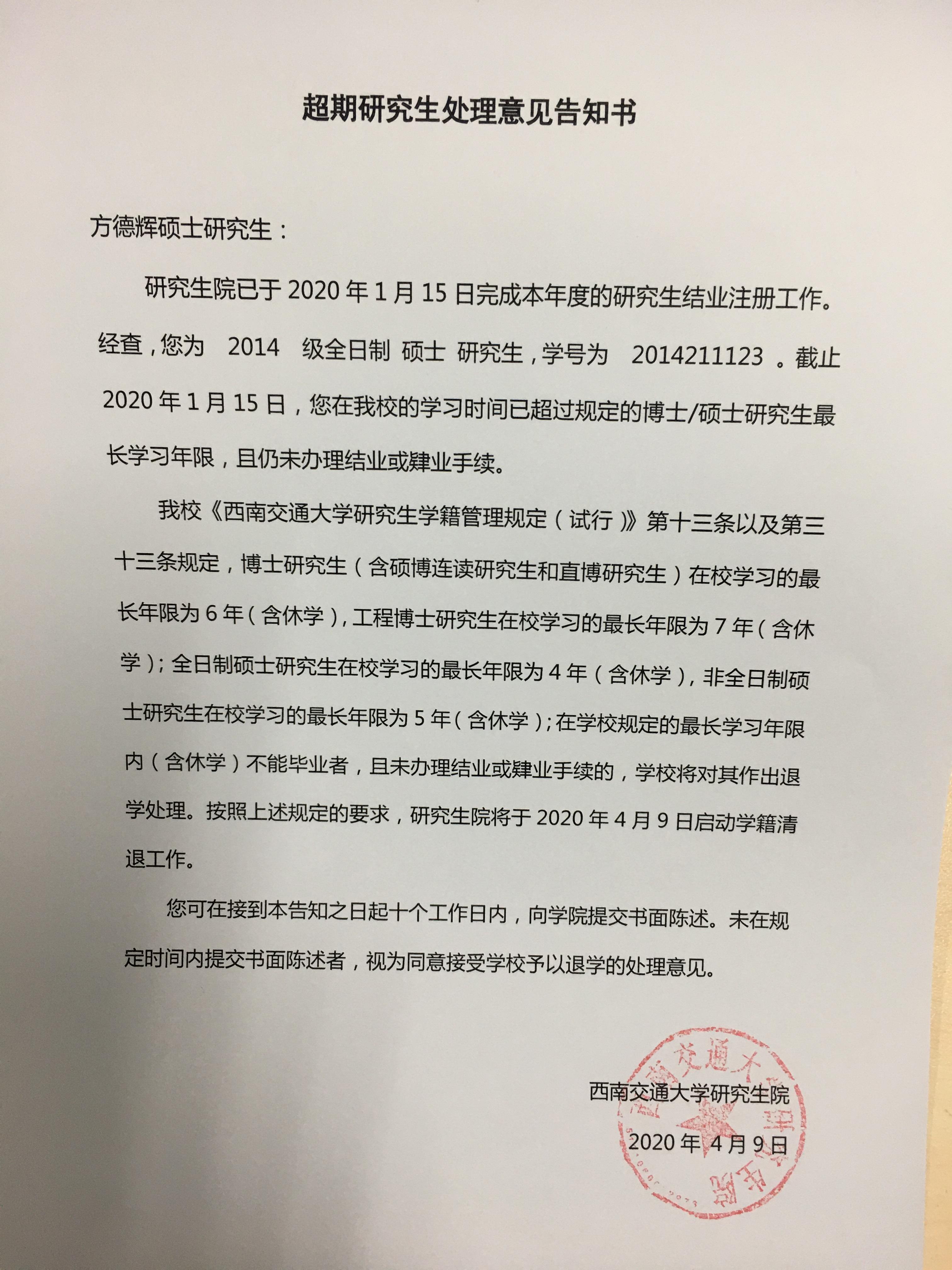 研究生院已于202049日发布《超期研究生处理意见告知书》(简称《告知书》),并由学院组织将《告知书》送达至超出最长学习年限的研究生。