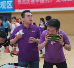 随后,“水果保卫战”、“气球保卫战”、“剪刀石头布”三项趣味横生的小游戏接踵而来。在这里,可以看见毫无形象可言的“吃西瓜大赛”,MPA师生共同低头狂啃手中的大西瓜,一顿风卷残云,引得围观的观众们捧腹大笑;在这里,可以看见脚上绑满气球的队员,想方设法去偷袭别组队员,踩中气球后露出狡黠一笑,溜之大吉;在这里,你可以看见泼“水”奋战的MPA学子斗智斗勇,强势出击,让在场的老师和同学们忍俊不禁,拍手叫绝!队员们在场上你争我夺,在良好的团队配合下每分必争,活动现场紧张而热烈。最终,MPA2020级1班的“无敌螃蟹队”勇夺桂冠!