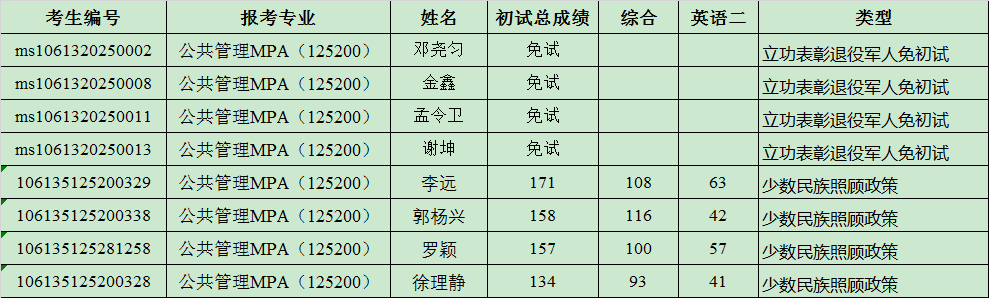根据教育部《2025年全国硕士研究生招生工作管理规定》(教学[2024]4号)文件相关规定,经相关部门审核和学校复审,现将符合立功表彰退役军人免初试政策和少数民族照顾政策考生名单(详见附件)公示如下。考生可参加报考学院、报考专业的复试。